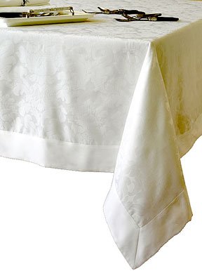 Our easy-care Royal table linens have an oversized damask design on a white background All tablecloths except round are finished with a five-inch border The placemats are finished with a two-inch border Made of 55 cotton45 polyester fabric Royal never needs ironing We a recommend at 10-12